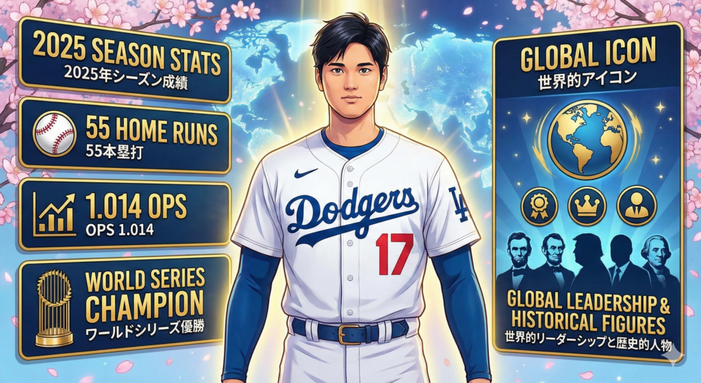 (画像イメージ解説) 中央に立つ大谷選手の背景には、2025年の驚異的な数字「55本塁打」「OPS 1.014」が黄金色に輝いています。一方で、その対角にはリンカーン大統領のような歴史的指導者のシルエットが描かれ、彼がいかに「記録」だけでなく「記憶と歴史」に刻まれる存在になったかを1枚で表現しています。