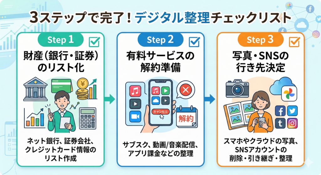 今日は、愛する家族に余計な苦労をかけないための、スマートで愛のあるデジタル整理術を伝授するよ。最後まで一気に読んでみて!