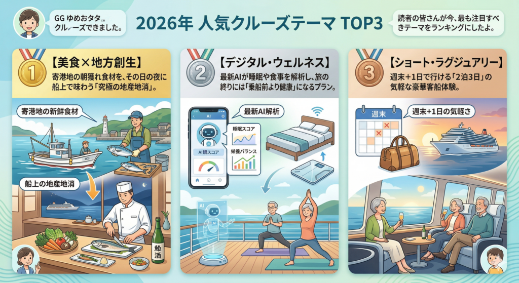 今回は、福山からトレンドを追い続けるGG夢太が、10万人が注目する「2026年国内クルーズの真実」を徹底解説するよ。読み終わる頃には、きっとあなたも海風を感じたくなるはず。