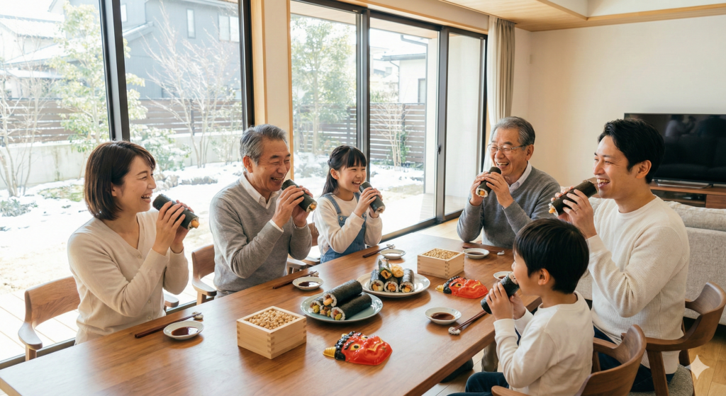【イメージ画像生成プロンプト:幸せな節分の食卓】
