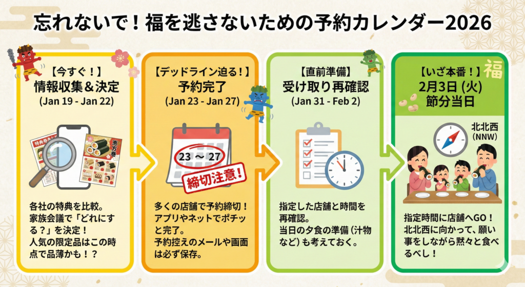今日が1月19日ですから、あと1週間もありません!特に人気アニメとのコラボ商品や、数量限定のプレミアム恵方巻は、締切前に完売することも珍しくありません。「週末にゆっくり考えよう」と思っていると、痛い目を見ます。