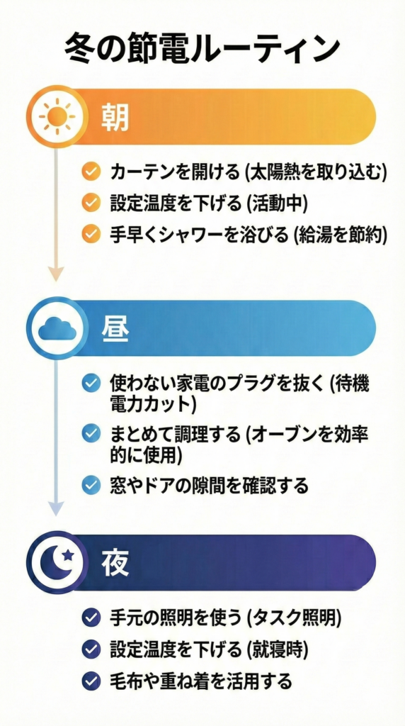ここまで紹介したテクニック、全部覚えるのは大変ですよね。 そこで、今日から使える「節電ルーティン」をチェックリスト形式でまとめました。これをスクリーンショットして保存し、毎日の習慣にしてみてください。