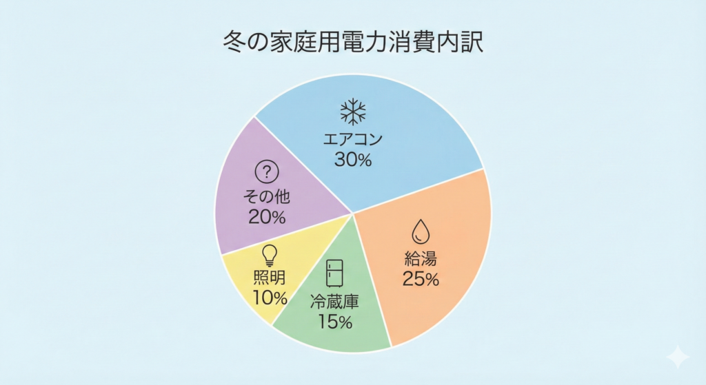 以下のインフォグラフィックをご覧ください。冬の家庭における消費電力の割合を可視化したものです。