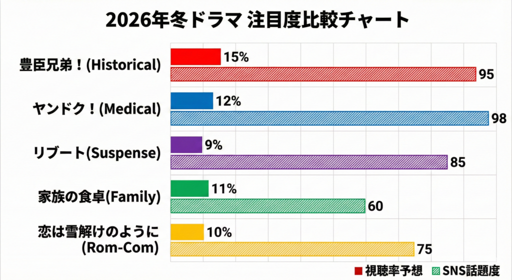 これらの状況を一目で理解できるよう、主要5ドラマの「視聴率予想」と「SNS話題度」を比較したチャートを作成しました。これを見れば、今世間がどのドラマに注目しているかが一目瞭然ですよ!