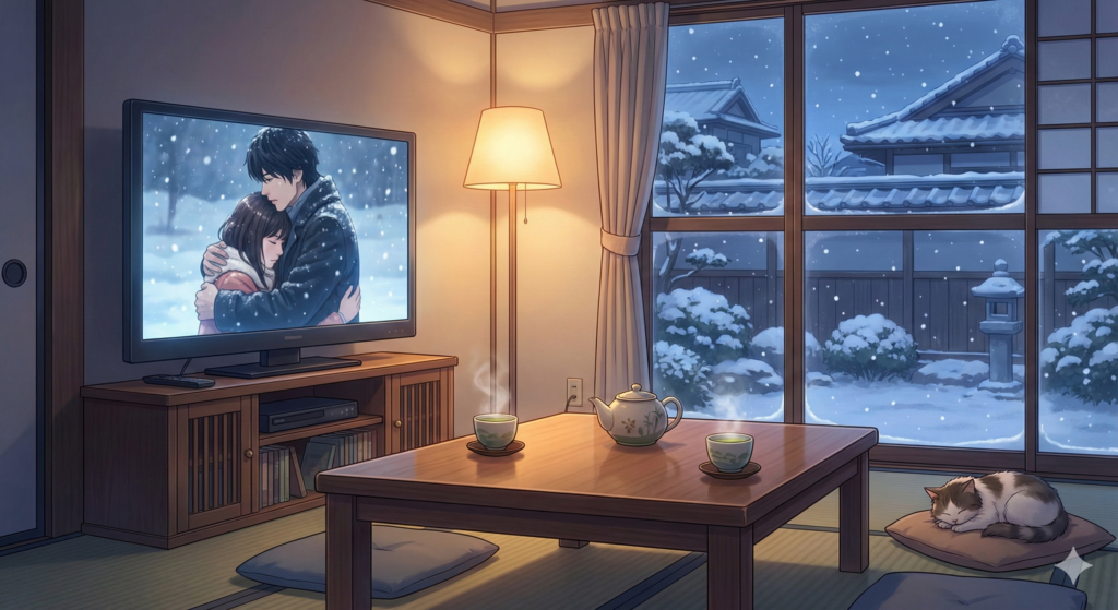 冬の夜長、暖かい部屋でドラマの世界に没入する時間って最高ですよね。そんな至福のひとときをイメージした画像をご用意しました。これを見て、今夜のドラマ視聴の気分を高めてください!