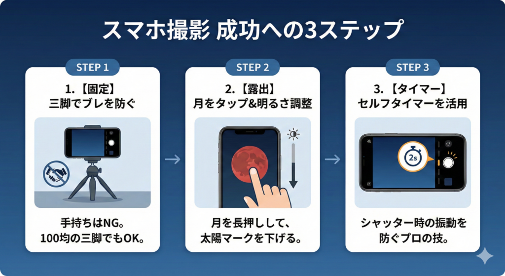 • 三脚は必須: 100均の三脚でも構いません。手ブレを防ぐのが成功の9割です。