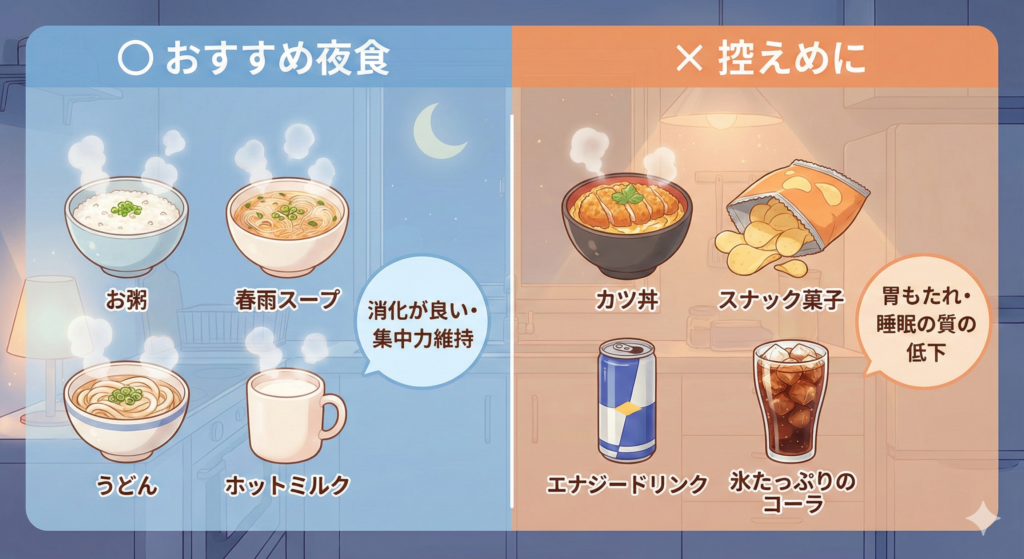 糖質を一気に摂りすぎると、血糖値が急上昇し、その反動で強い眠気に襲われます。また、脂っこいものは消化に時間がかかり、脳に血液が行かなくなる原因に。夜食は「サラッと、軽く」が基本です。