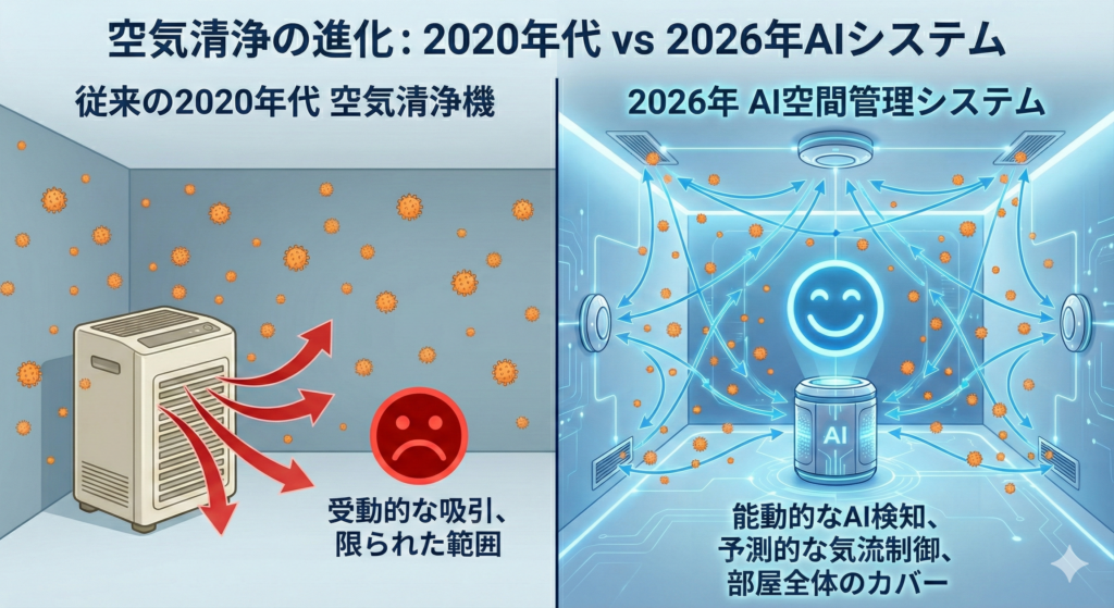 ここで、従来の空気清浄機と2026年の最新システムの違いを分かりやすく図解してみましょう。