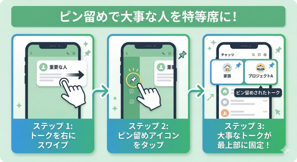 これで、どんなに新しいメッセージが来ても、大事なトークが下に流されることはない。 「あれ、どこ行った?」と指をシャカシャカ動かして探す時間は、もうおしまい!