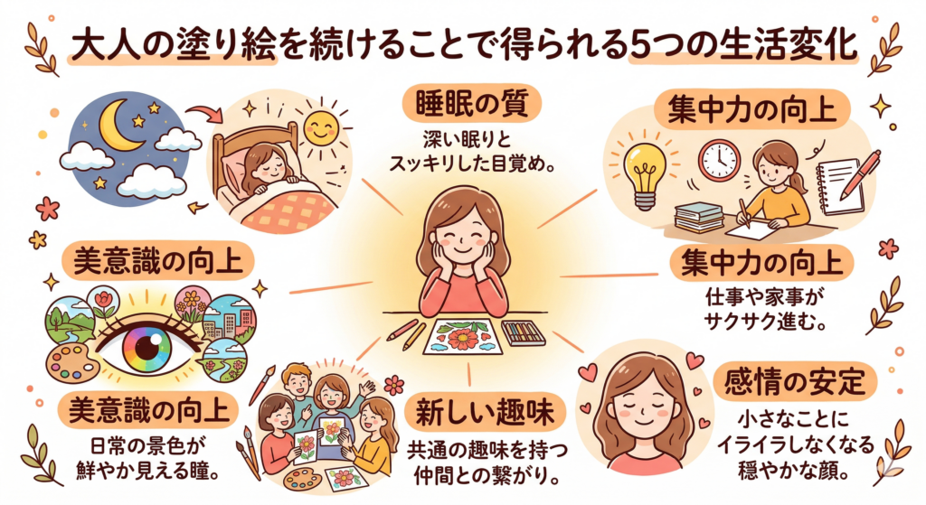 塗り絵の効果を視覚的にまとめると、いかにこれが多面的に良い影響を与えるかが一目で分かるはずだよ。