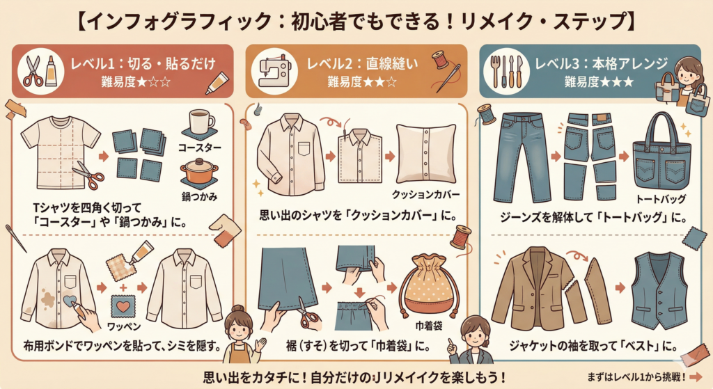 「捨てられない」のは、あなたがその服を愛していた証拠。その愛を、別のカタチで活かすのがリメイクの醍醐味なんだ。