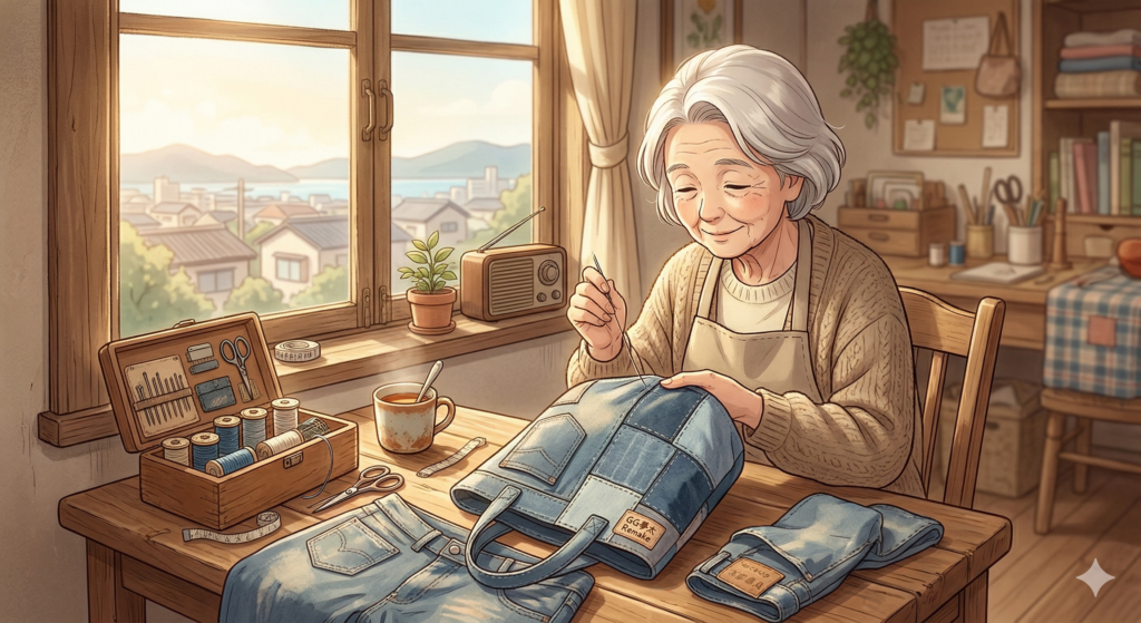 🥸GG夢太:「たまちゃん、最近の若い子は古いデニムをわざわざ切り刻んでバッグにしとるらしいなぁ。わしの若い頃は、穴が開いたら継ぎ接ぎして着るのが当たり前じゃったが、今はそれが『おしゃれ』なんか?」