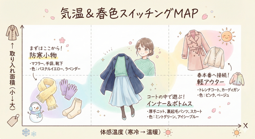 - マフラー・ストール: 顔まわりに最も近いアイテムだからこそ、レモンイエローやラベンダーなどの春色を持ってくると、肌のトーンがパッと明るく見えます。素材はウールやカシミヤのまま、色だけを春に変えるのがコツです。