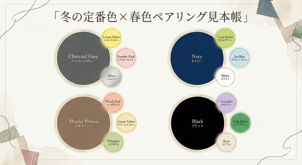 - グレーやネイビーといった冬の定番色と春色をペアリングする